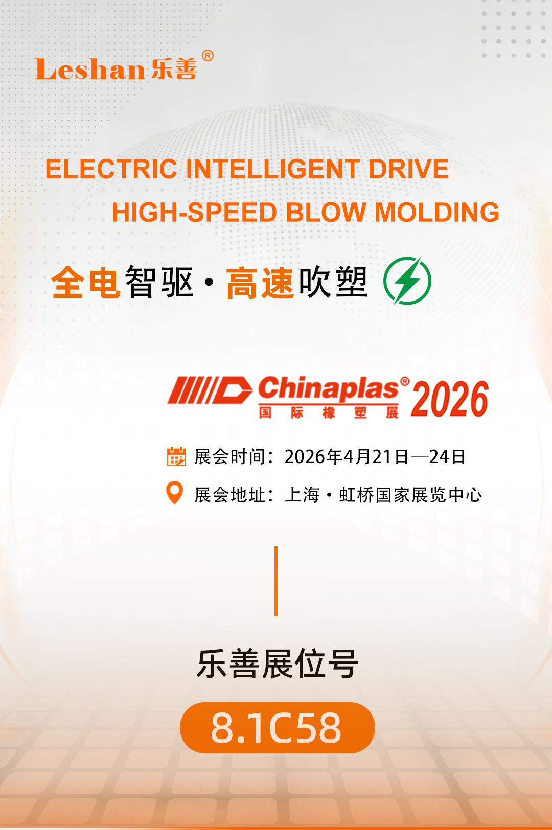 我们诚挚邀请新老客户、行业伙伴,莅临乐善智能展位(8.1C58)参观洽谈,近距离体验全新全电动吹瓶机的卓越性能,深入交流合作事宜、共探行业发展新路径、共谋共赢新未来。2026年4月21—24日,上海国家会展中心,乐善智能在8.1C58展位,与您不见不散!